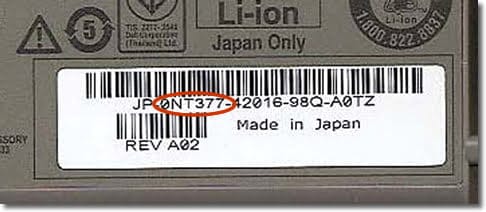 La batterie à pour numéro de série : JP‐0NT377‐42016‐98Q‐A0TZ . Toutes les pièces DELL auront pour syntaxe : XX‐0XXXX‐XXXXX‐XXX‐XXXX